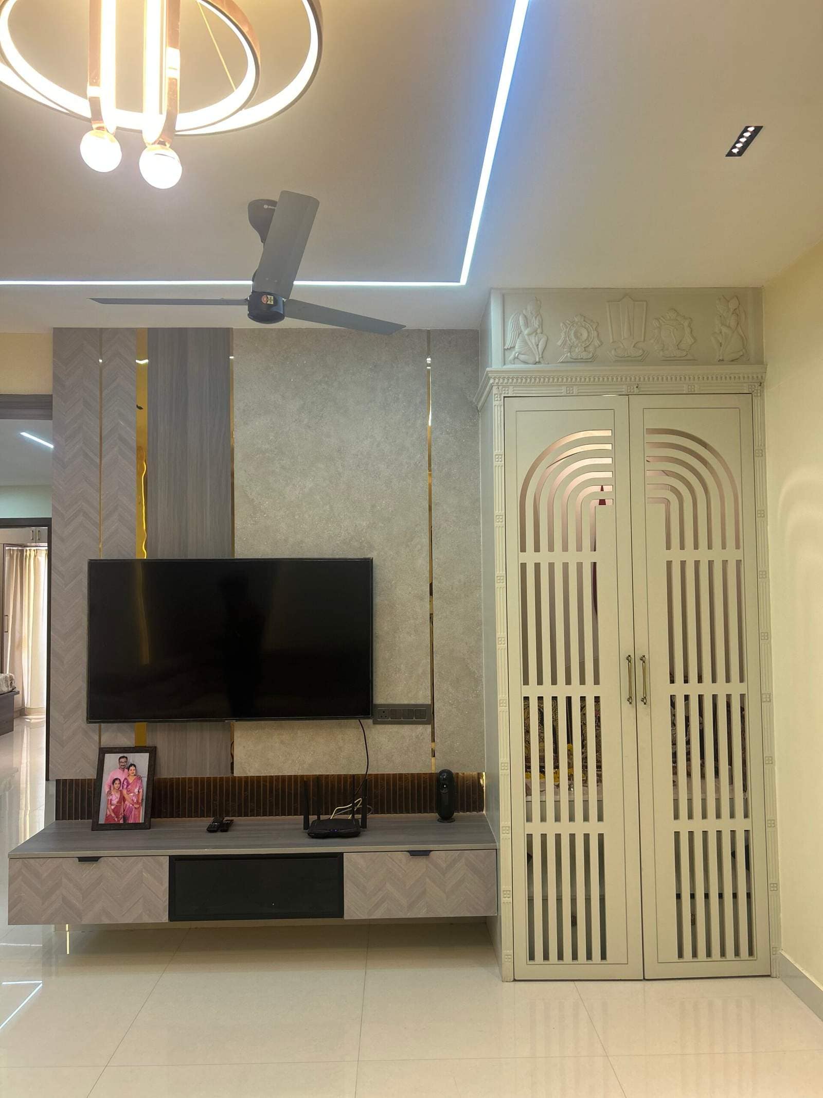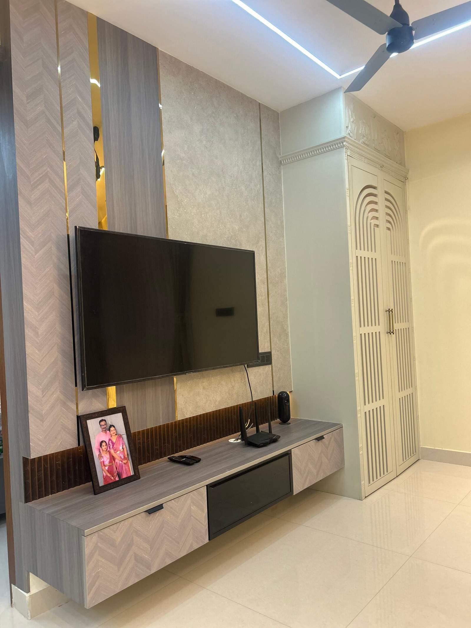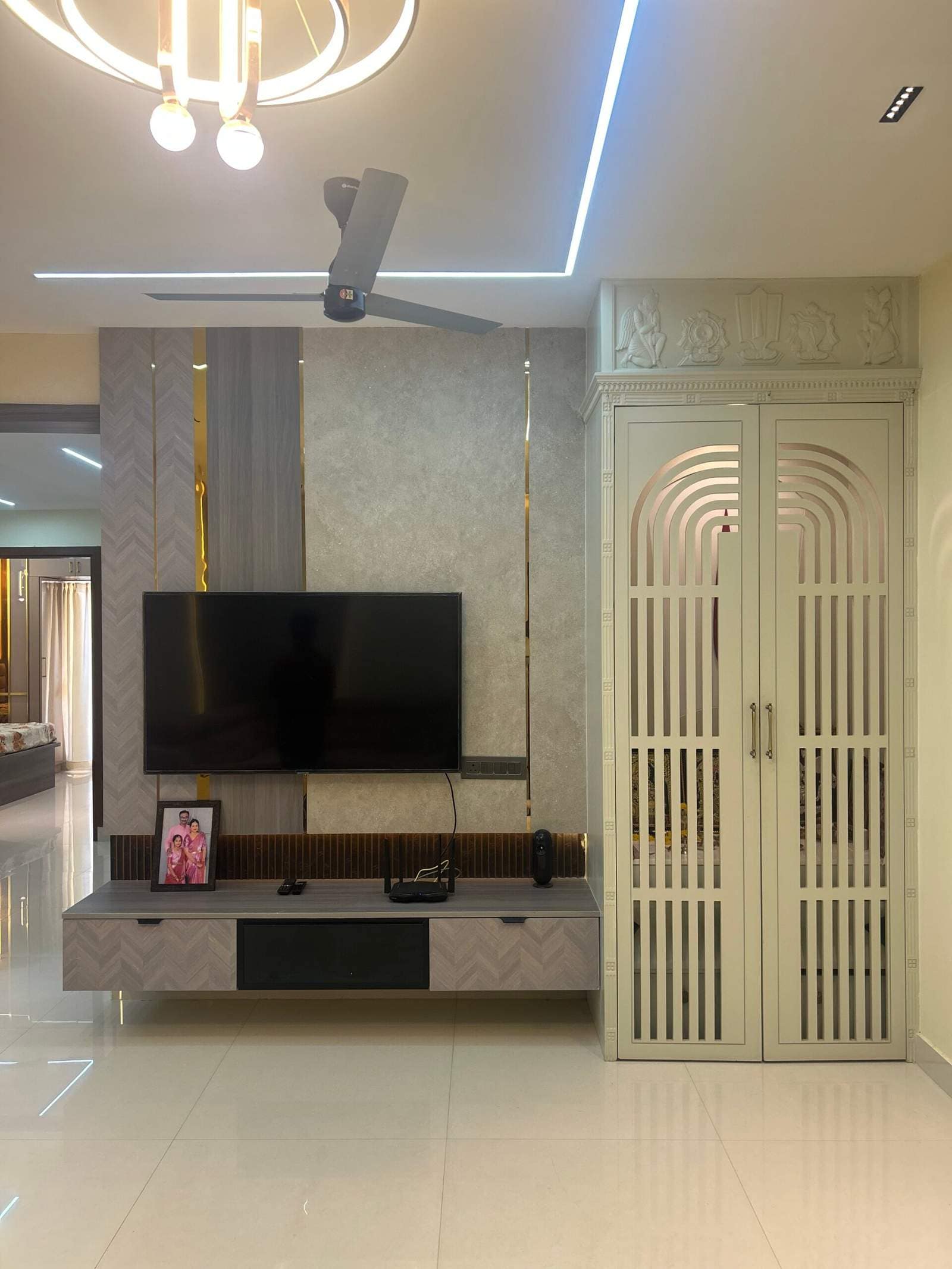 The living area makes a bold statement with a grey background laminate TV unit accented with gold T-patti detailing.
