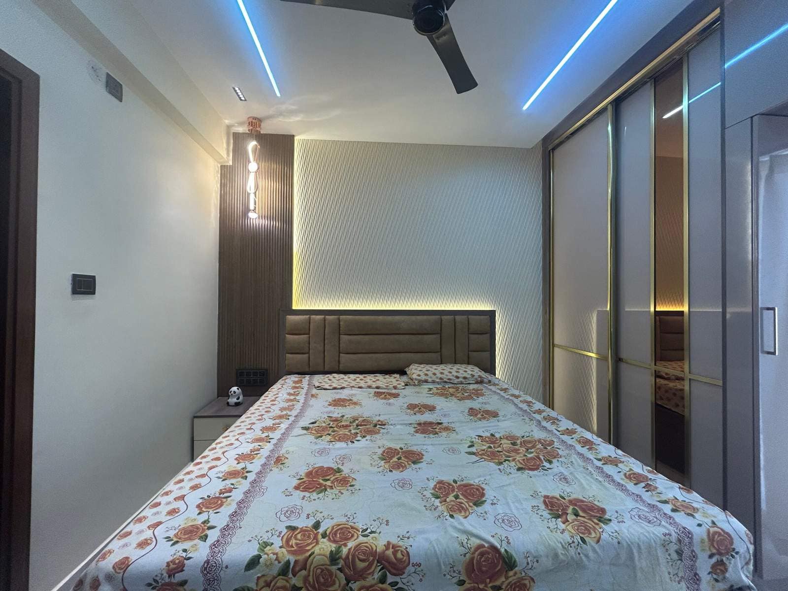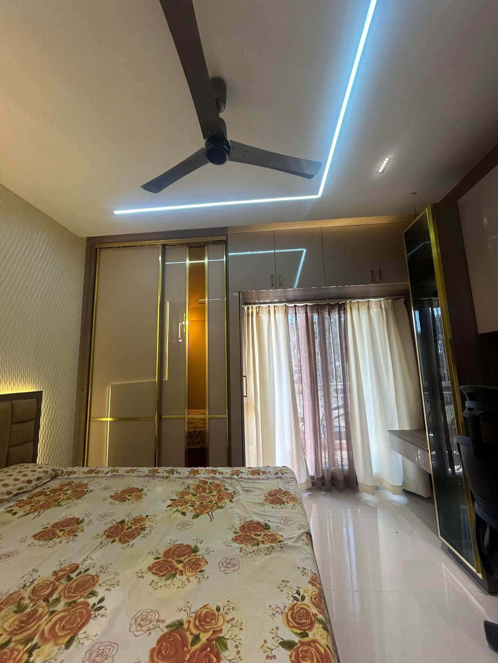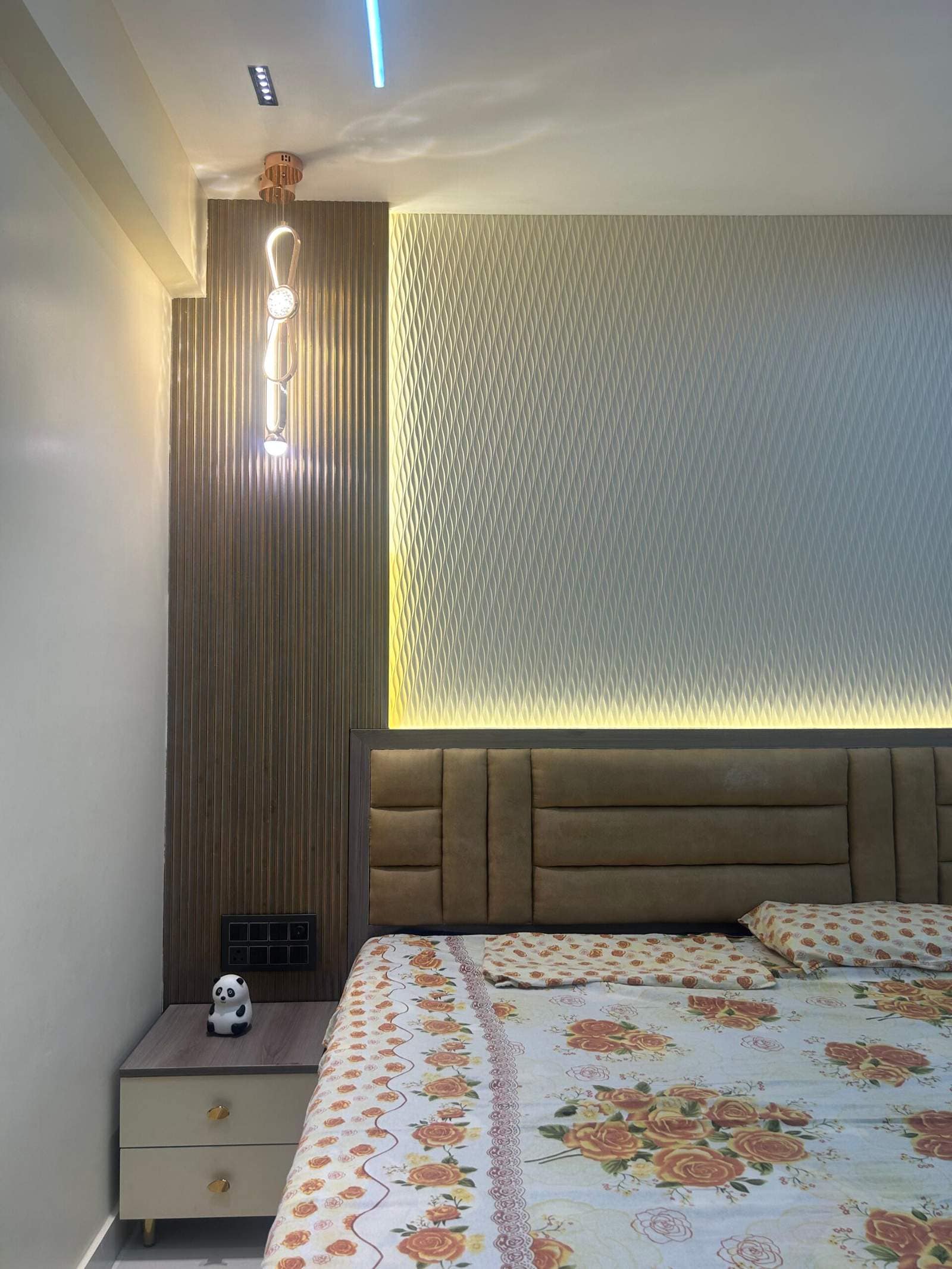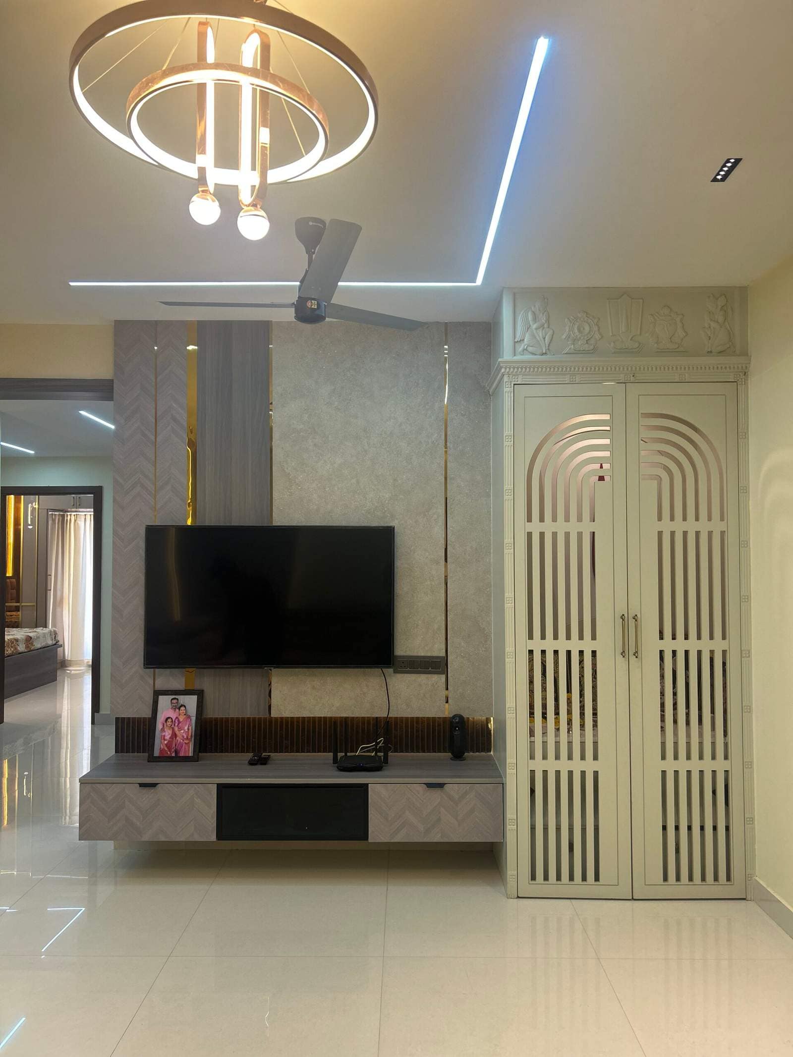 The living area makes a bold statement with a grey background laminate TV unit accented with gold T-patti detailing.