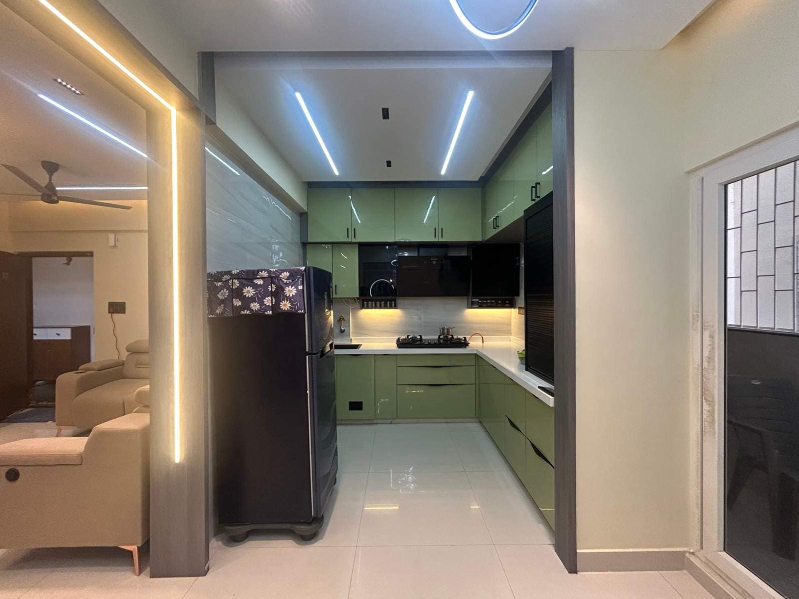 The kitchen is the heart of every home. For this Bangalore 3BHK, Olangana Design created a sage green acrylic modular kitchen, one of the most trending colours in 2026 interior themes.