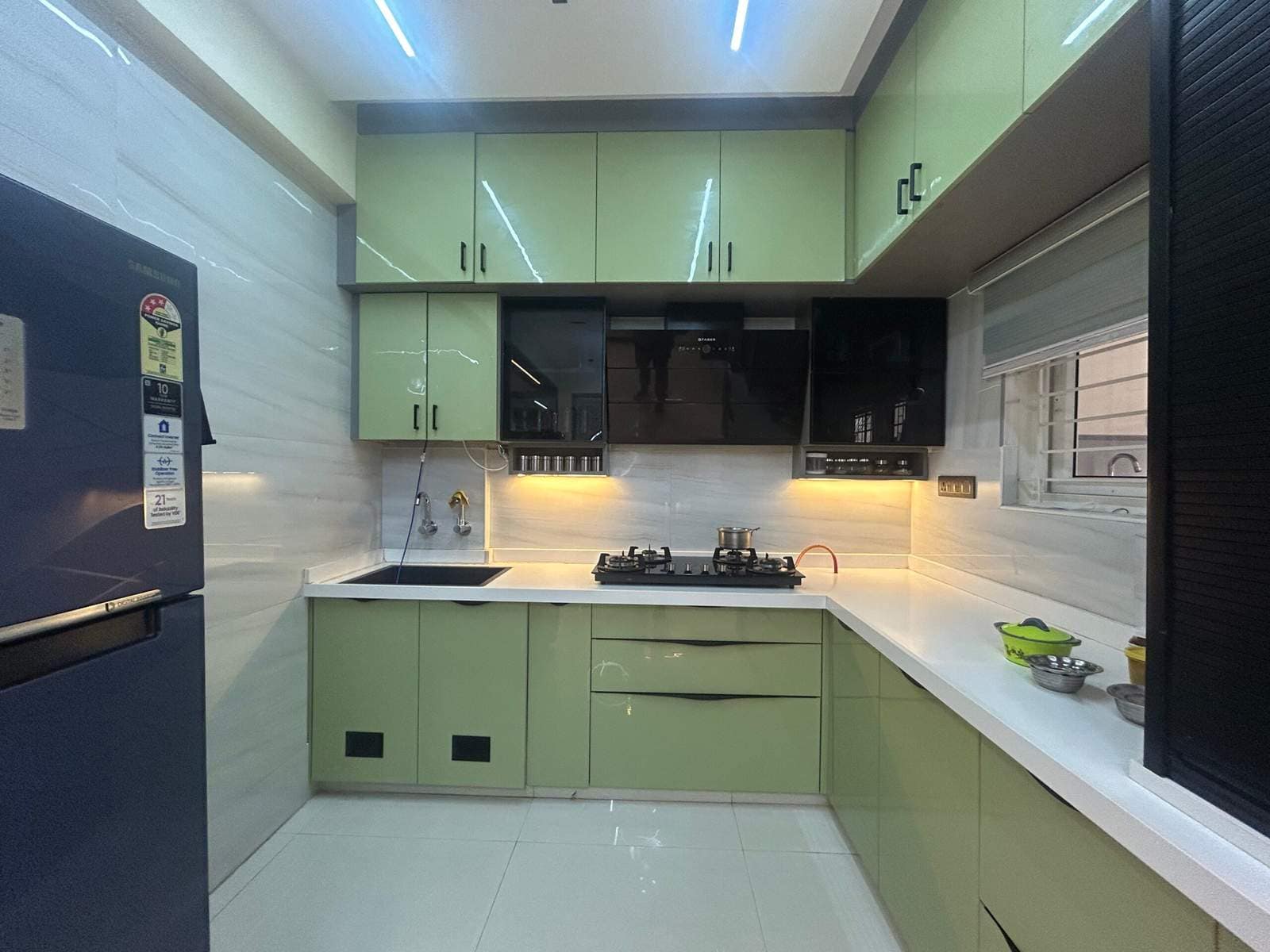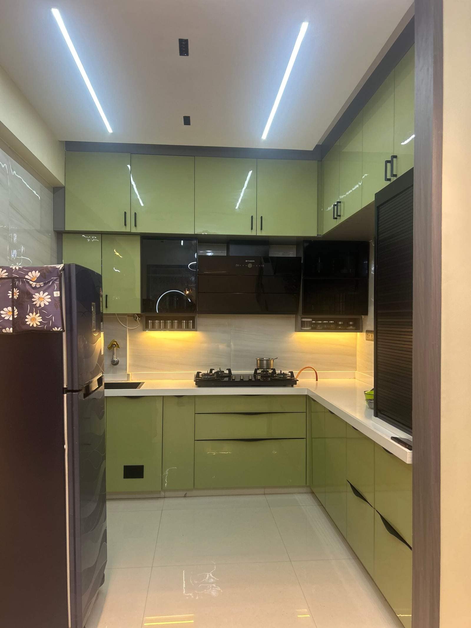 Sage Green Acrylic Kitchen with Profile Lighting - Modern Modular Kitchen