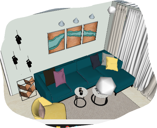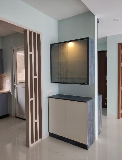 Our client wanted this living space to be designed in a very minimalistic yet radiant, our team bringing clients thoughts into reality perfectly executed this place using white ruff lamination for tv unit replacing sand like feel with rustic lamination to give coastal appearance complementing the whole look with quirk white floral and blue hued sofa to bring in a vibrant energy adds required strike to the living area.