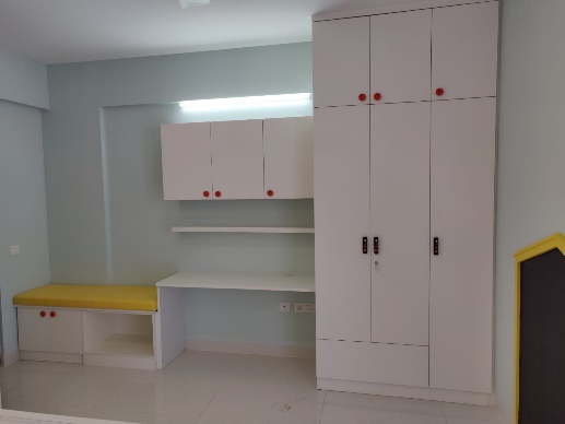 Our client wanted this room for their 1-year-old kid, this theme based room with bold colours popping out executed by our team thoughtfully affixing study and toy storage with seating alongside elegant white finish kids wardrobe and a custom made cot with a hut kind of panelling painted in yellow to give striking touch.
