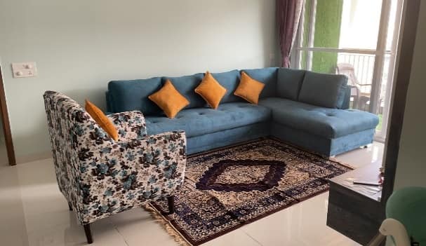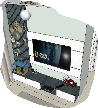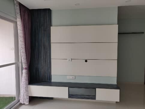 Our client wanted this living space to be designed in a very minimalistic yet radiant, our team bringing clients thoughts into reality perfectly executed this place using white ruff lamination for tv unit replacing sand like feel with rustic lamination to give coastal appearance complementing the whole look with quirk white floral and blue hued sofa to bring in a vibrant energy adds required strike to the living area.