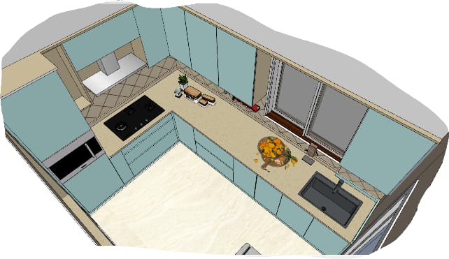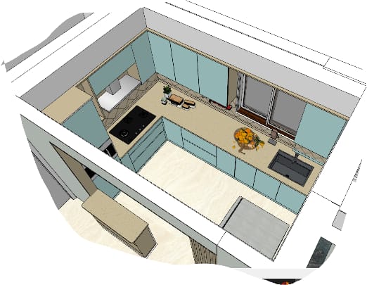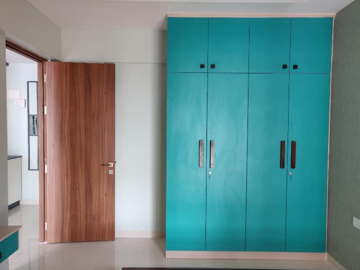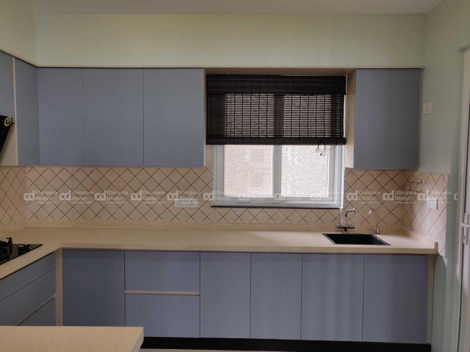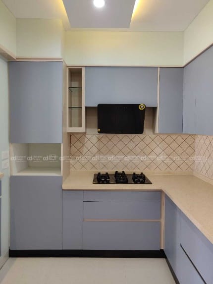 The handelless modular kitchen was curated using matt ocean blue laminates for kitchen cabinets adds serene touch and kitchen slab to facilitate back tiles, integrating small black texture sink on countertop contracting with kitchen slab and micro-oven in the tall unit. Our clients were satisfied seeing how this empty space has been transformed into elegant handelless modular kitchen.