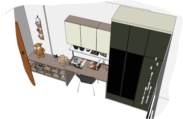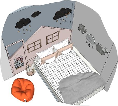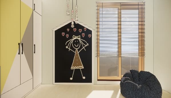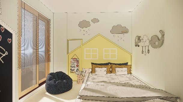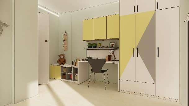 Our client wanted this room for their 1-year-old kid, this theme based room with bold colours popping out executed by our team thoughtfully affixing study and toy storage with seating alongside elegant white finish kids wardrobe and a custom made cot with a hut kind of panelling painted in yellow to give striking touch.