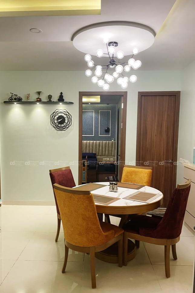 Due to space constraints, we created four-seater round dining table with rustic and mustered colour palette seating, ceiling lights were perfectly complementing the placement of dining with a designer light highlighting the area, a simple ledge with spotlight topping the decors used.