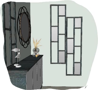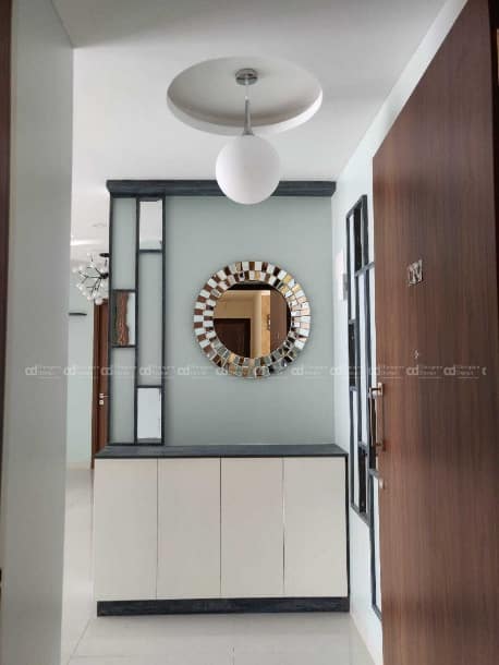 The Foyer space is beautiful mixture of textures and styles, white laminated wooden shoe rack along with a decorative mirror and wall panelling followed rustic pattern laminates with mirror and costal décor elements on both the side of the wall makes this space edgy.