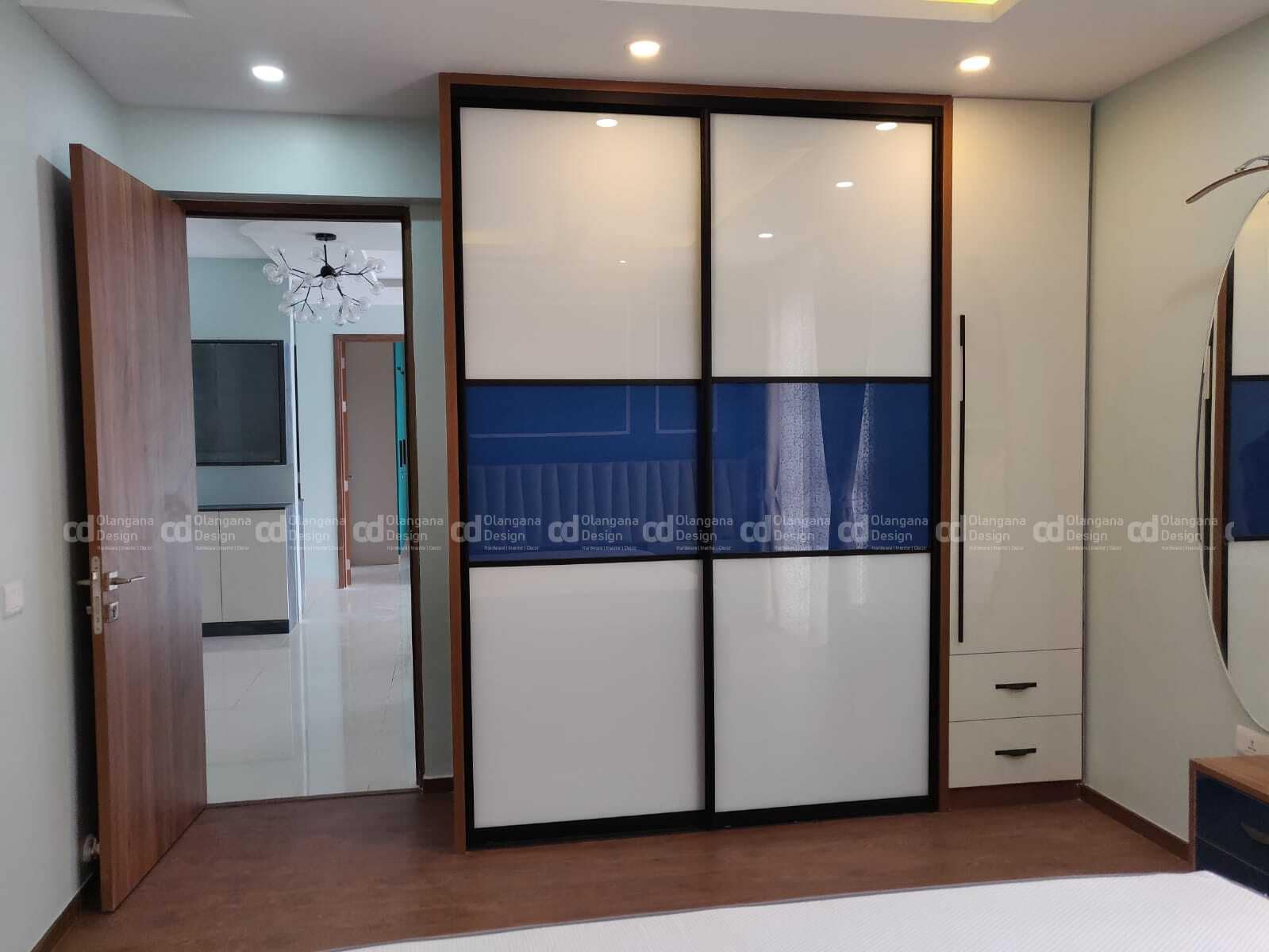 We executed this master bedroom with ceiling height exquisite wardrobe in hues of royal blue and milky white finish, a storage unit next to the sliding door and beautiful dresser with oval mirror concept, the customised pastel curtains were designed to drop from ceiling to go with the headboards of custom-made cot highlighting the back wall with lovely blue wallpaper and European style beadings, finishing the design with simple false ceiling.