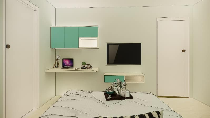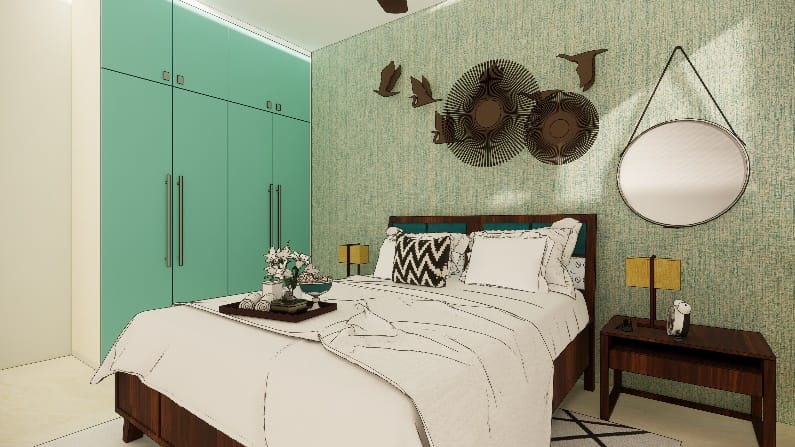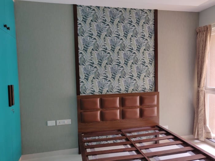 Guest room was designed in a way makes anyone feel at home instantly. Enlisted under best interior designing company in Bangalore follow perspective planning to understand the client needs and create a value for money. To design this room, we choose radiant varying in hues of blue and brown colour pallet wardrobe with wooden handles, working table come tv unit, re used cot with cushion headboard and statement wall papers between two custom made panelling to give chic and dramatic effect.