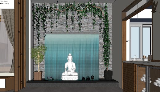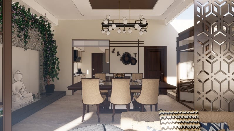 With Our clients contrasting design tastes our team attempted modern theme with touch of contemporary balances different styles for this dining space that exudes peace and warmth. The dining area had adequate space to play around, placing a six seated dining to accommodate the family members ornamented in designer hanging light on the top, a Puja unit with designer glass doors and a beautiful water fountain in the sky light opening space brings in ample of natural light that drew views of the outdoors into the heart of indoors.