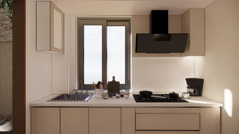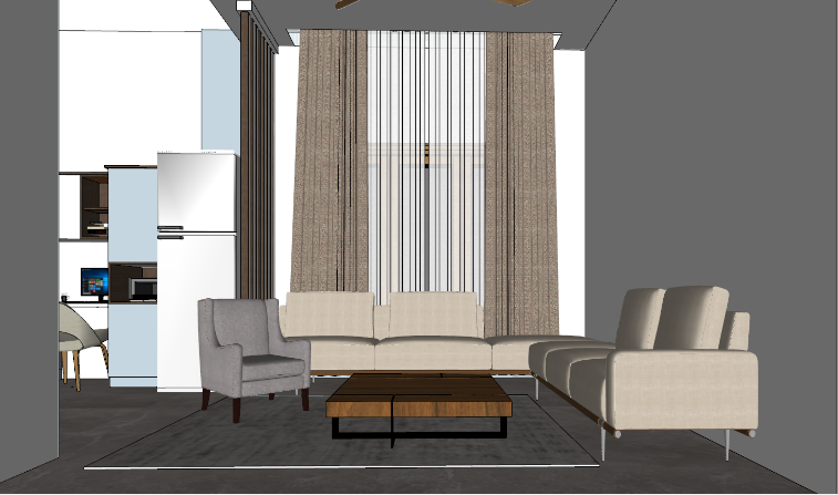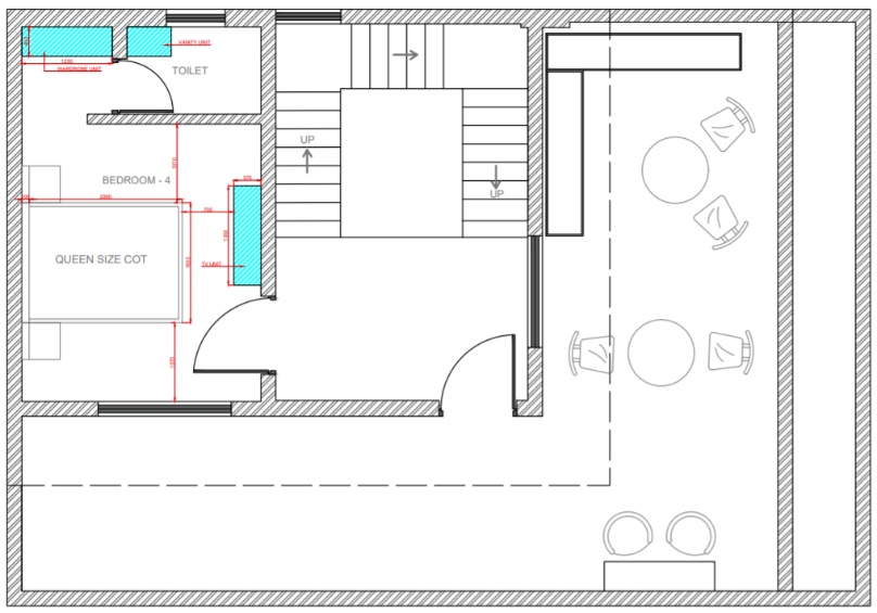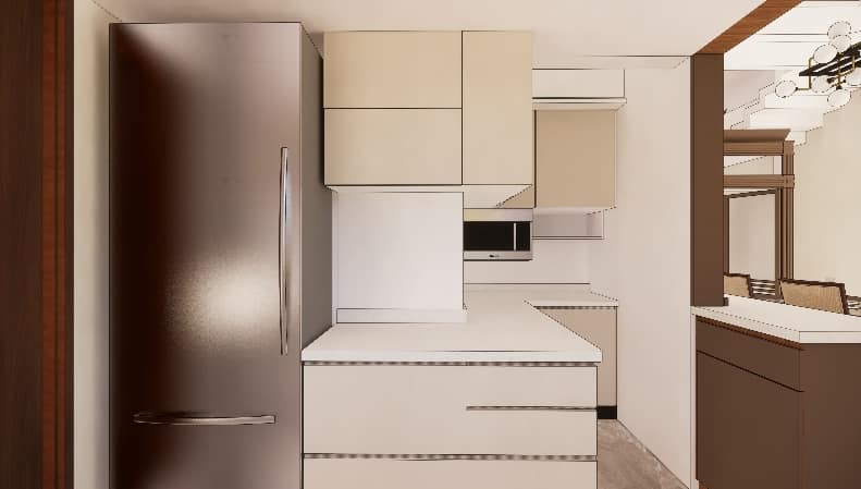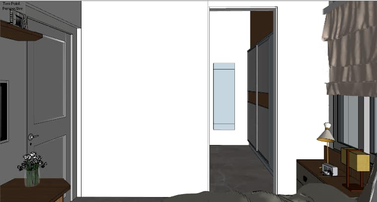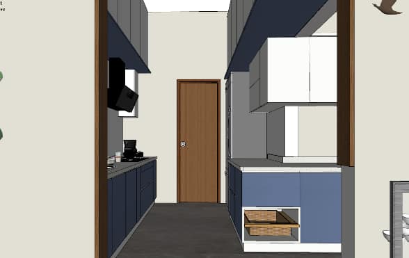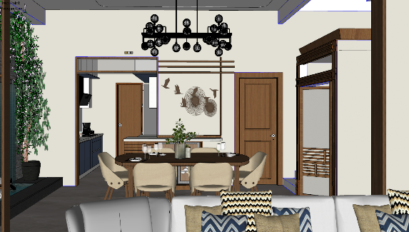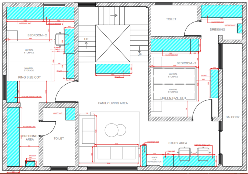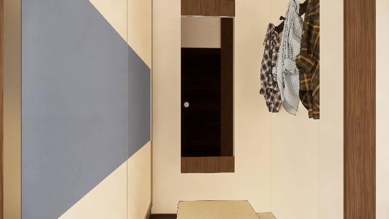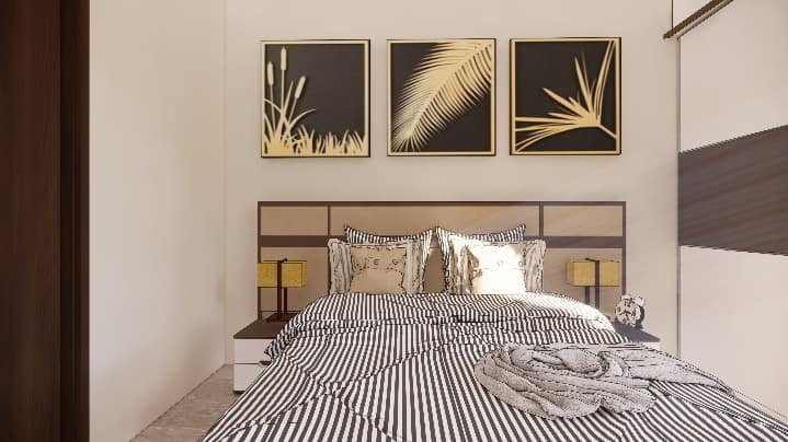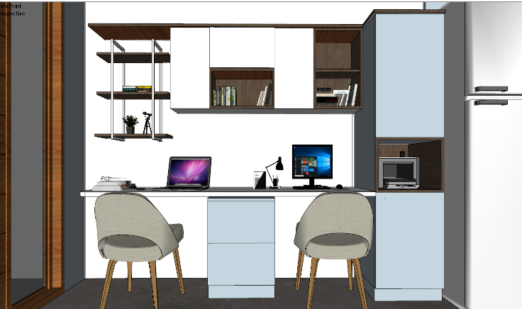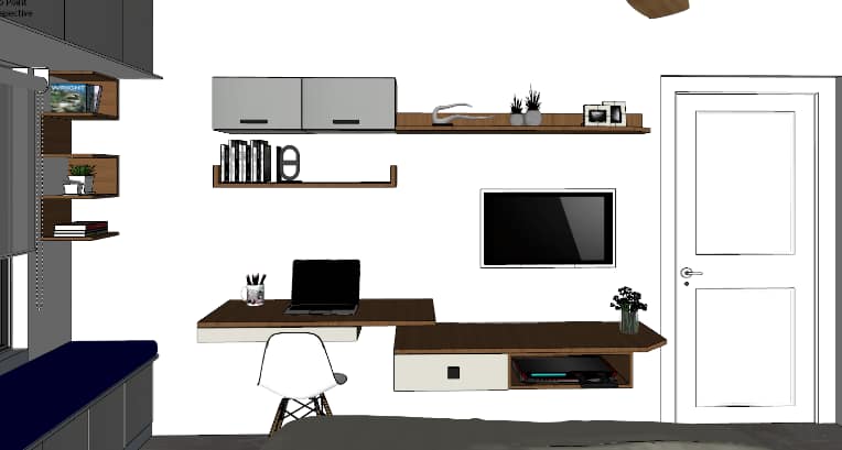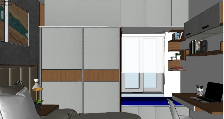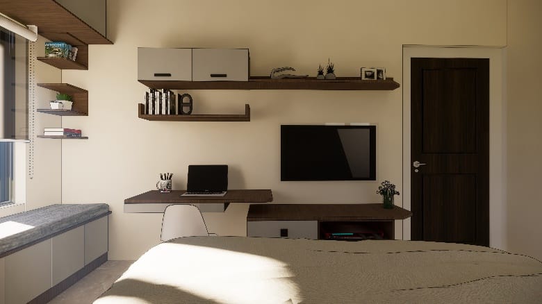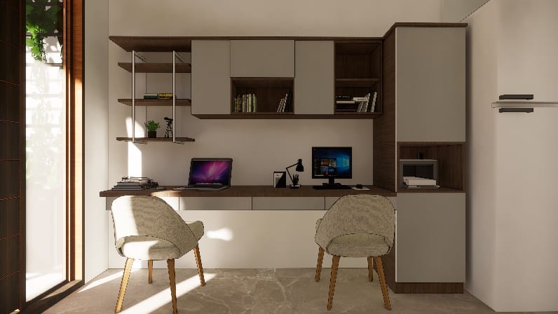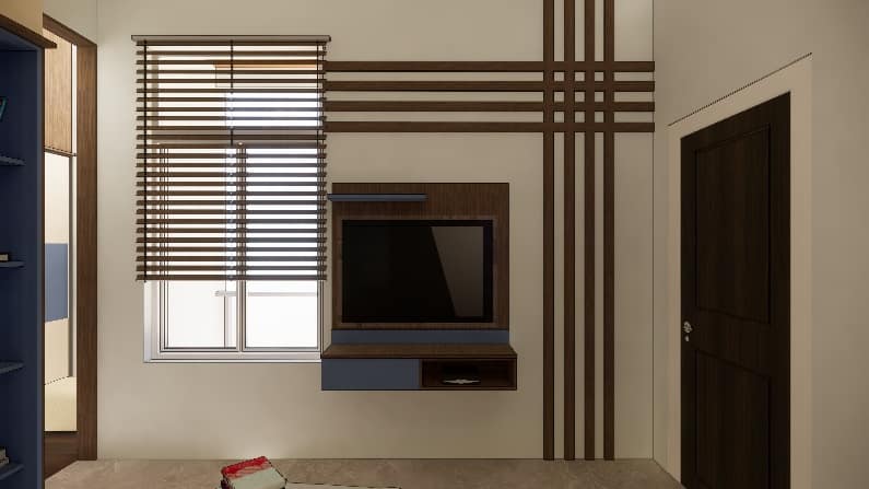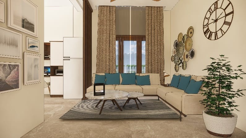 The wall shade is subtle beige adorned with artefacts and photo frames and blue shade cushions on the sofa to balance the beige and burnt grey in the living ornamented in a designer hanging light, Further amplified the space with the addition of two people working space near the door that leads to balcony, our designers’ visualised the space to have clutter free layout.