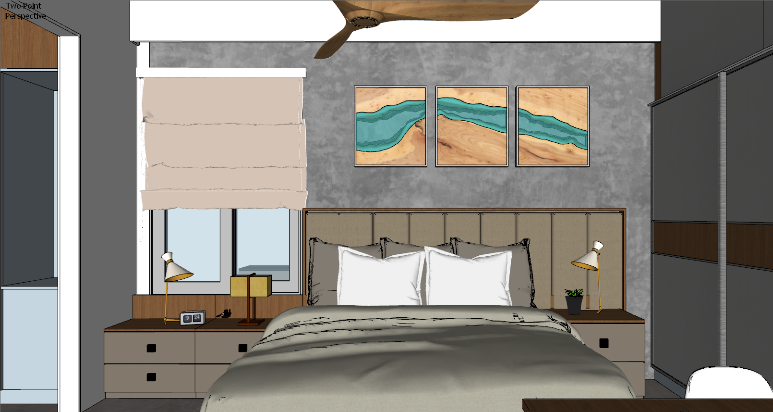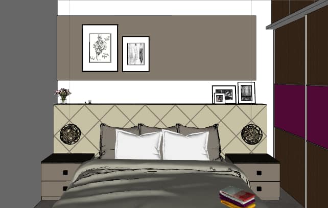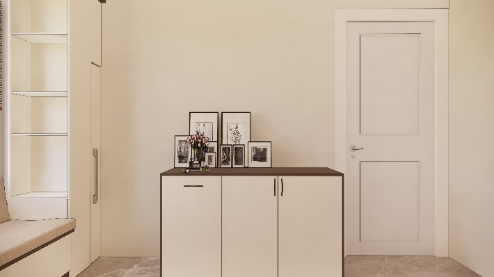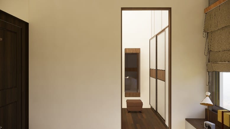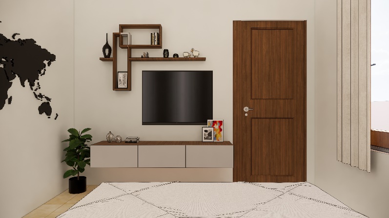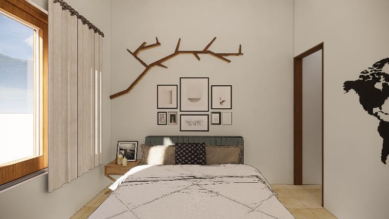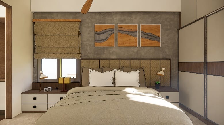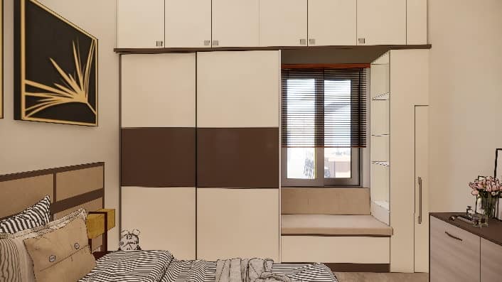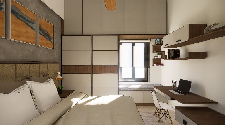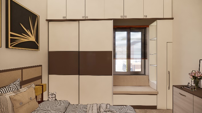 We executed this bedroom in a muted colour palette, A simple sliding wardrobe in hues of brown and beige with a hidden mirror and window seating on the right with tall unit for storage highlighting a back wall of the cot with beautiful photo frames enhances the beauty of the entire room.