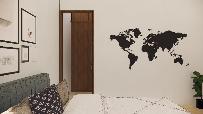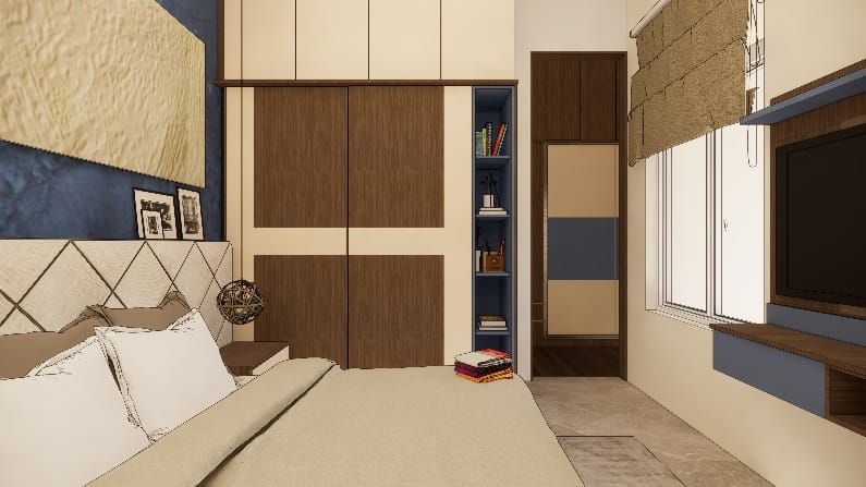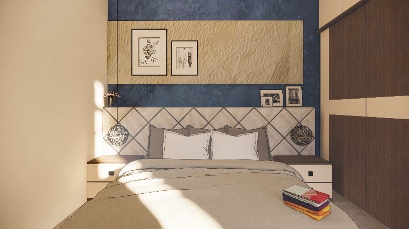 We executed this bedroom to dreamy and artsy in a blue colour palette, we followed same theme for all the rooms ,a simple sliding wardrobe in hues of brown and beige tall unit for storage on the right highlighting a back wall of the cot with beautiful photo frames and textured wall paint in beige truly draws an attention.