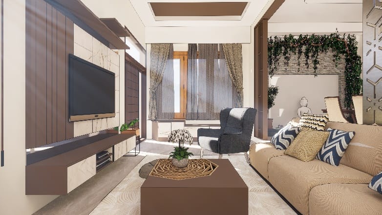 The best part of the house was living it was fun to conceptualize and execute , the use of eco-friendly terra Cotta jail partitions and earthy tone laminate shades and polish for the entire living gives earthy vibes to the space.