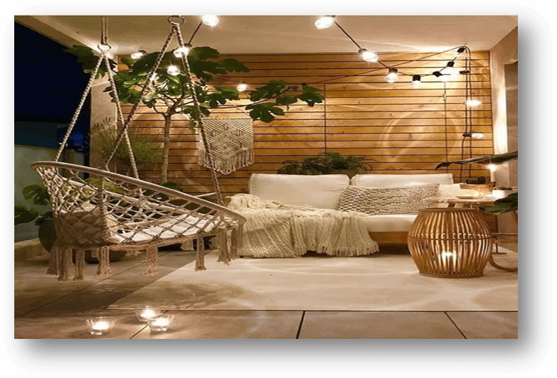 If you have a covered balcony space then you can easily hang a few pendant lights or string lights. They appear to be trickling down from the ceiling which creates the effect of being in an enchanted forest.