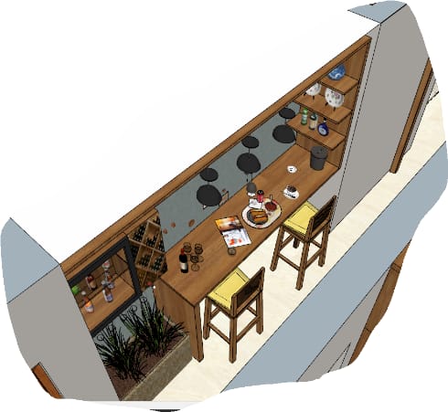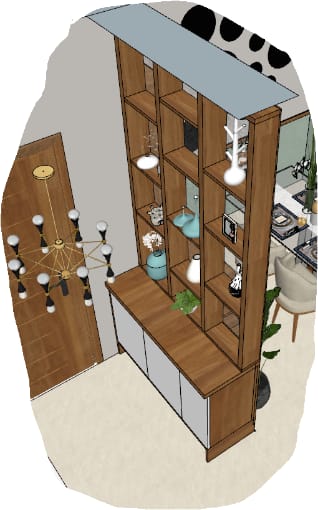 We wanted to leverage this passage space to give the clients a small bar unit with heigh top seating. The cabinet is designed with ample storage for bottles and wine glasses and extra counter space for mixing & serving, adding statement lightening giving this unit a beautiful visual uplift.