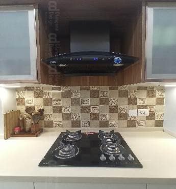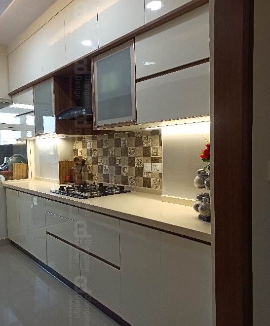 Acrylic shutters were used to give seamless glossy appearance to the kitchen cabinets, Glossy finish designer tiles were used, to match with cabinets.
