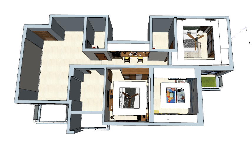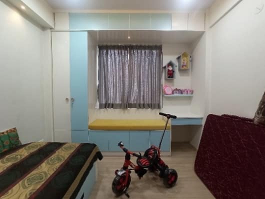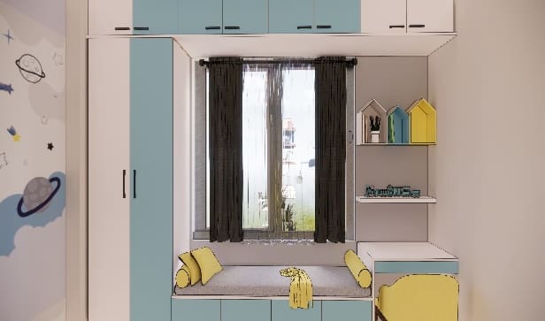 The idea worked something like this we Olangana design one of the best interior designers in Bangalore crafted this place keeping in mind both usage and aesthetical appearance, space was designed to accommodate one adult and a kid keeping in mind the space to play around, place for study and a window seating along with the wardrobe.
