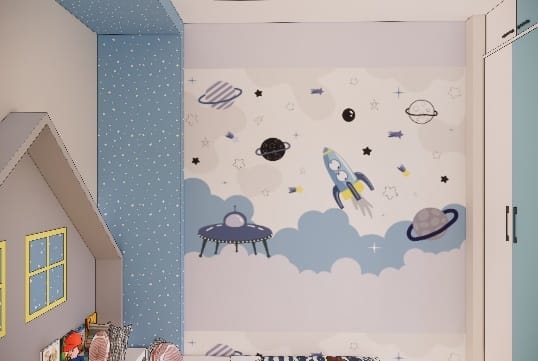 We finally love how Kids room has turned out with delightful use of vibrant colour space art wall papers.