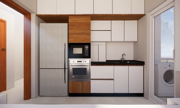 The kitchen is equipped with tall unit beside the refrigerator partitioned into small pantry units, specifically designed for OTG appliances such as microwave oven.