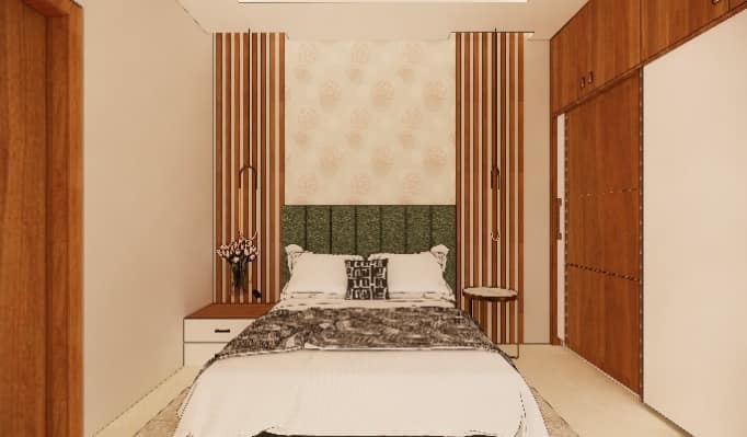 The master bedroom done in a bare minimum design, so minimal yet absolutely comfortable, wooden panelling on wall behind both the side of the bed and headboards with velvet cushion finish.
