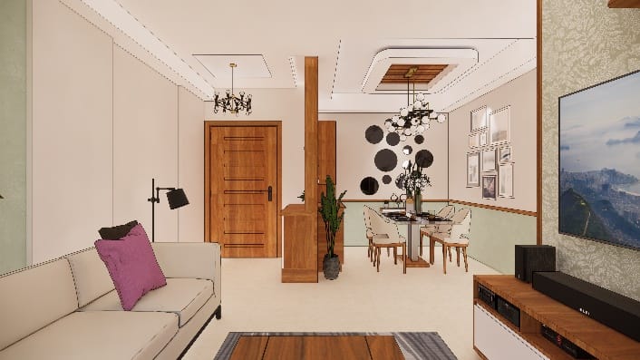 We followed the design pattern throughout as you see, we created a shoe rack and a partition above to separate dining to create a foyer on the other side. We had good enough space to create a puja as per the vastu and storage unit along we included wall beadings, adding some vintage touch.