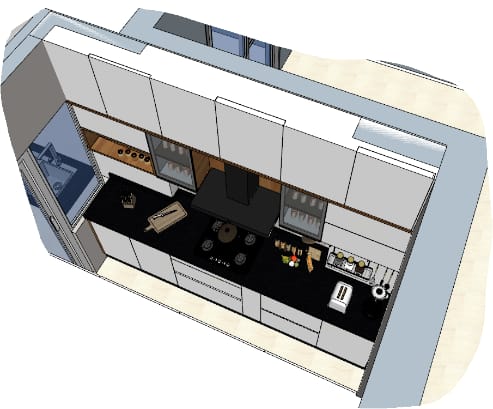 The kitchen was in use when we visited, the countertop was outdated and the floor tiles were not going with the theme and there were not enough electrical points for the functional requirements, this was another challenging place to design.
