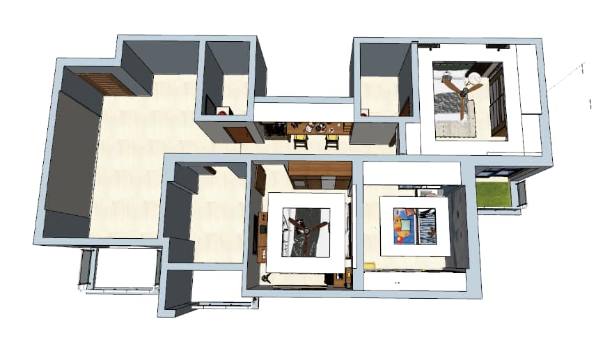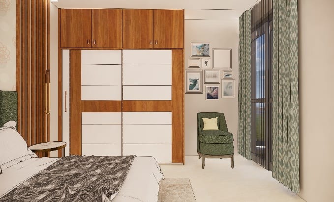 Small room with ample of lighting around, this room was dedicated to their son ,we were bit confused with their requirements as they had asked us design a working table, two people sleeping place and a wardrobe in such compact space.