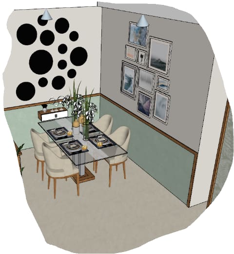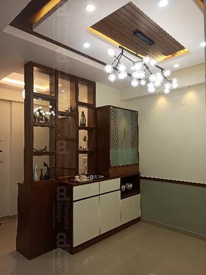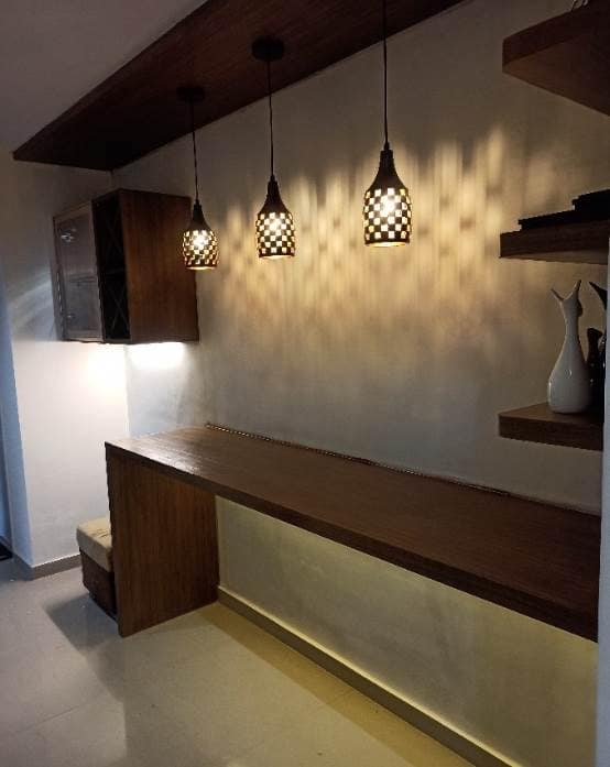 The Compact space as effectively used by our designers maximising the storage space for the crockery unit and Pooja room to the right corner, with minimal ceiling design using hanging lights to complete the look