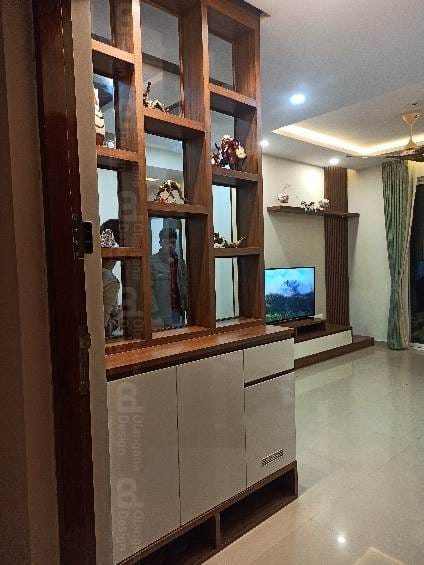 We followed the design pattern throughout as you see, we created a shoe rack and a partition above to separate dining to create a foyer on the other side. We had good enough space to create a puja as per the vastu and storage unit along we included wall beadings, adding some vintage touch.