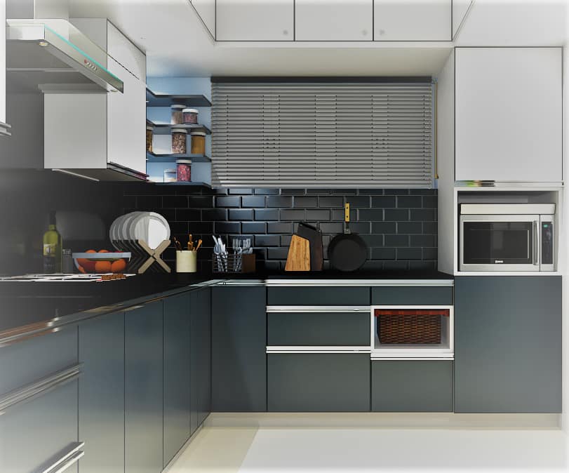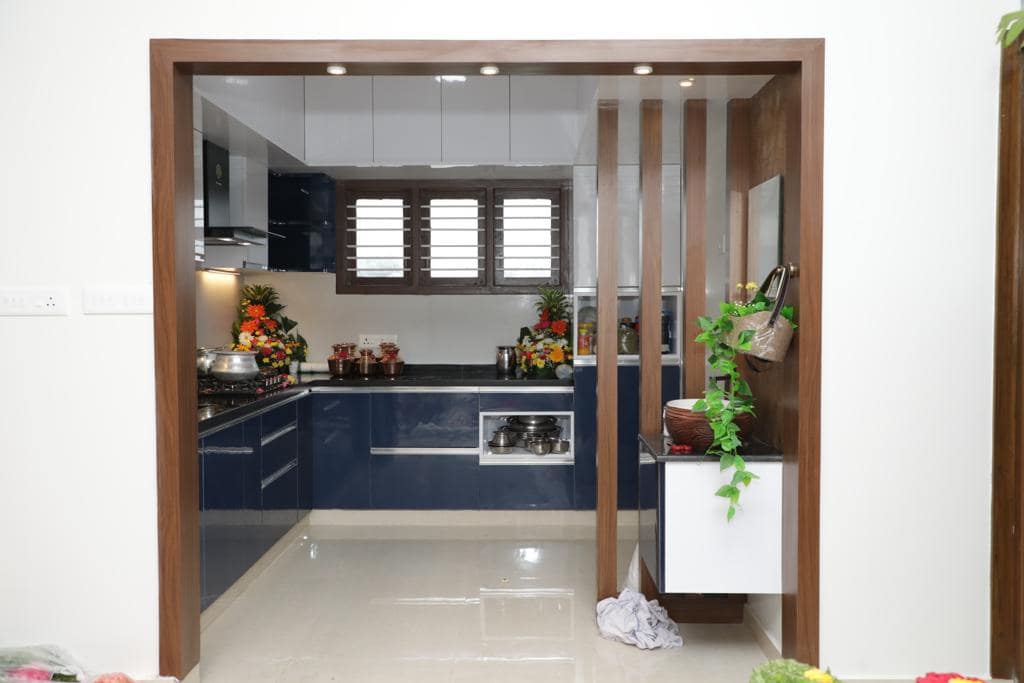 We have designed this bespoke kitchen in hues of royal blue and plain white cabinets, our team was mindful in picking right elements to fabricate this dreamy kitchen, right from back tiles to appliances, a tall unit specifically designed to accommodate OTG appliances like oven and wooden partition was made to sunder from rest of the space, we the best modular kitchen designer in Bangalore, create beautiful design concepts based on the client’s requirement.