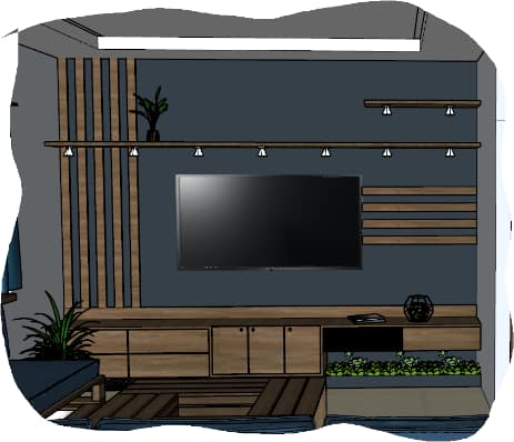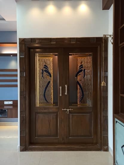Quaint and refined living area is fusion of modern architecture infused with traditional theme-based design crafted keeping aesthetic and comfort of the users in mind a simple tv unit and Puja unit tailored in designer wooden panelling with traditional door brings warmth into the space.