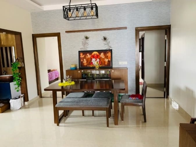 In a world full of modern decors this traditional chettinadu roofing style in the dining area custom designed and crafted by our team stands out from the rest, embellishing the wall with beautiful embroidery wall papers to evoke view of entry wall, geometrical shape arch in teak brown created to detach the dining from living space, four seater dining and a retro style hanging light took whole view to the next level.