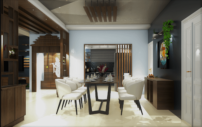 In a world full of modern decors this traditional chettinadu roofing style in the dining area custom designed and crafted by our team stands out from the rest, embellishing the wall with beautiful embroidery wall papers to evoke view of entry wall, geometrical shape arch in teak brown created to detach the dining from living space, four seater dining and a retro style hanging light took whole view to the next level.