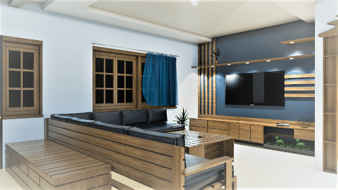 Quaint and refined living area is fusion of modern architecture infused with traditional theme-based design crafted keeping aesthetic and comfort of the users in mind a simple tv unit and Puja unit tailored in designer wooden panelling with traditional door brings warmth into the space.